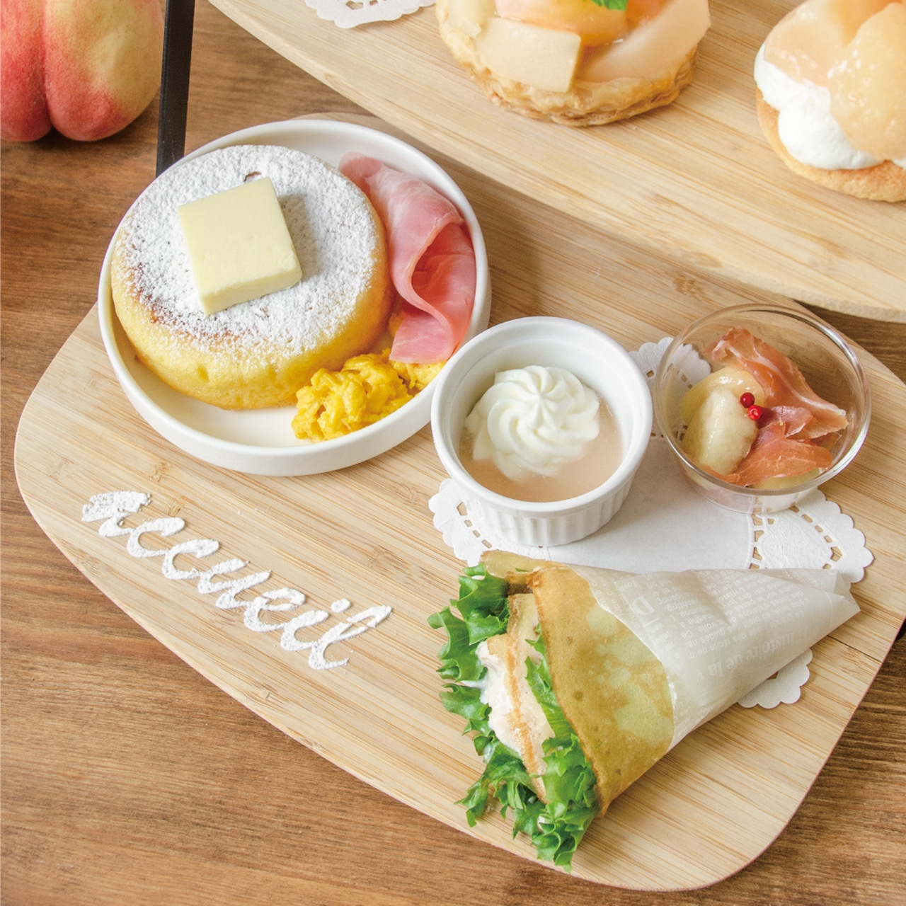様々な形で桃を楽しんでいただけるように桃のショートケーキや桃のパフェなどのスイーツに加え、アクイーユ初となるツナマヨクレープやミニパンケーキ(スクランブルエッグ&ベーコン)などのセイボリーで、存分に桃を味わえる彩り豊かな12品のアフタヌーンティーです。