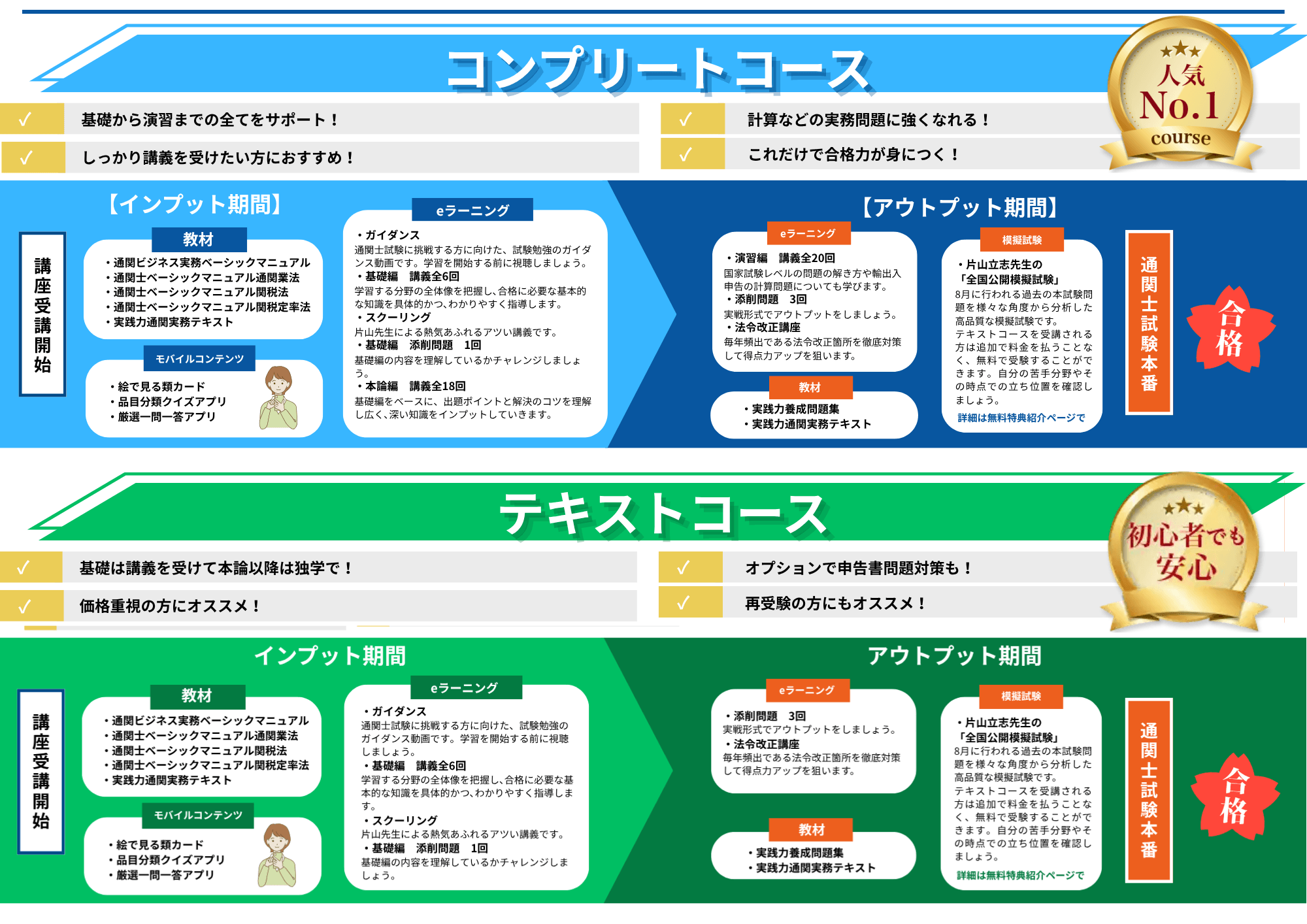 わかりやすいテキストと効率的な学習方法で通関士試験一発合格を目指す「通関士絶対合格通信講座」を運営。講師である片山 立志は、通関士試験受験指導30年以上のパイオニアであり、これまでに数多くの合格者を輩出しています。