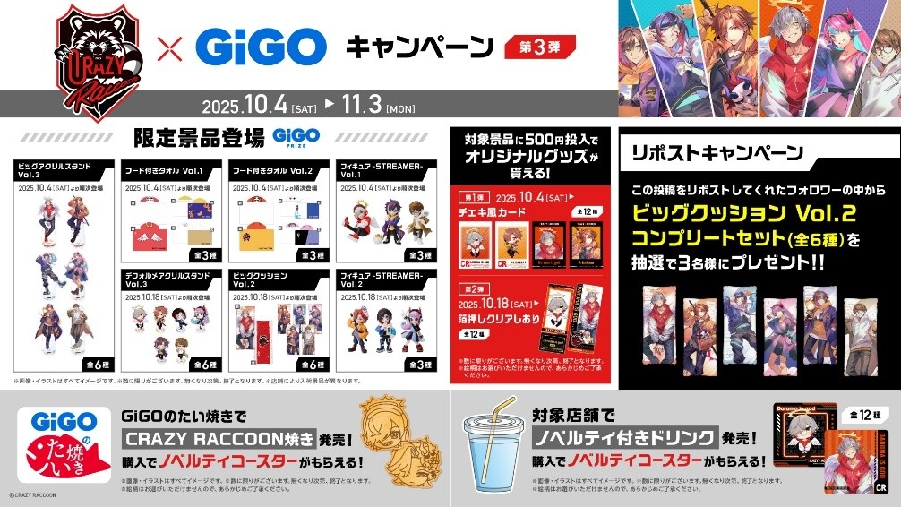 株式会社GENDA GiGO Entertainment(本社:東京都港区 代表取締役社長:二宮 一浩 以下、「当社」)は、当社の対象店舗において、2025年10月4日(土)より、「ゲーマーをかっこよく魅せる」をテーマに様々なシーンで活躍するesportsチーム「Crazy Raccoon」とコラボレーションしたキャンペーンを開催いたします。新規描き起こしイラストを使用した、当社限定のグッズが多数登場いたします。
