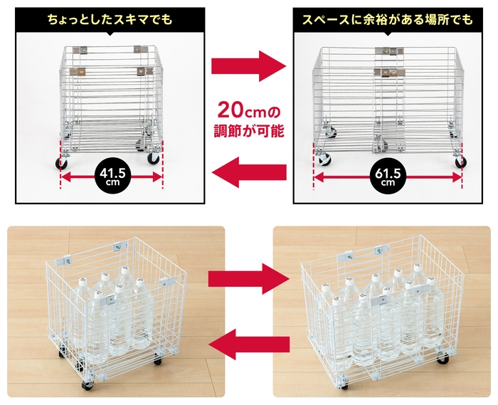 使用シーンや収納する物に合わせて、バスケットの幅を20cmの範囲で無段階に調節することができます。