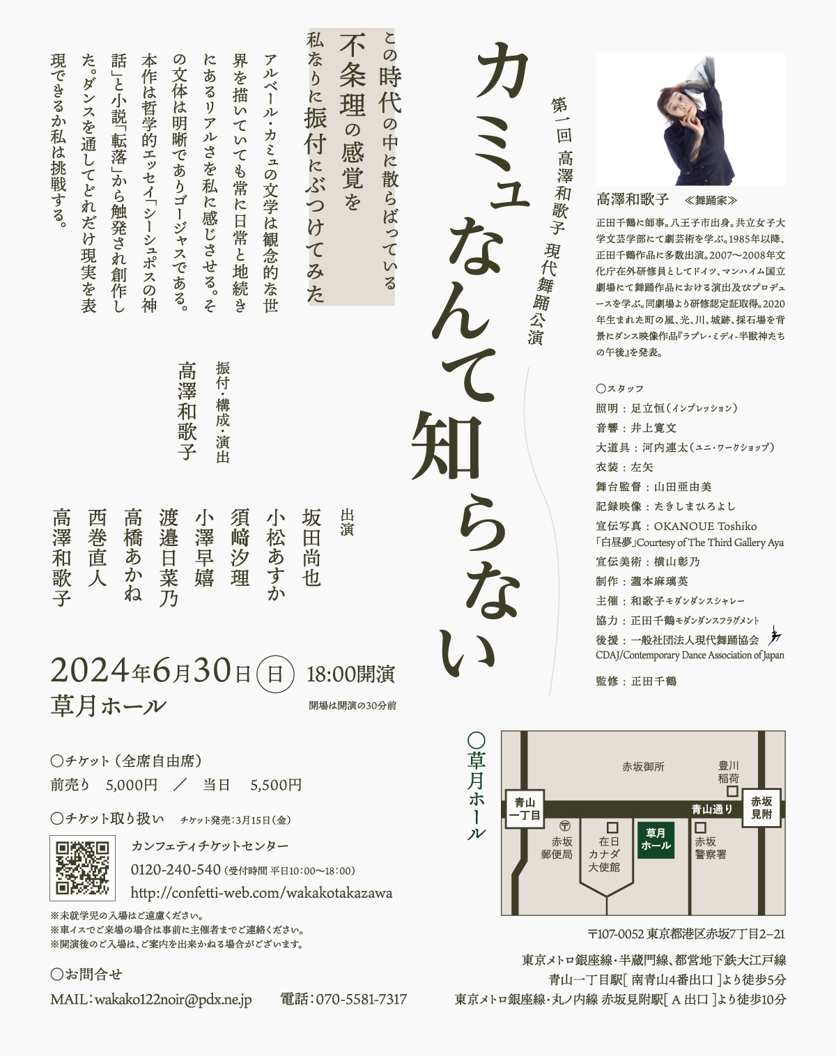 和歌子モダンダンスシャレー主催、第一回 高澤和歌子現代舞踊公演『カミュなんて知らない』が2024年6月30日 (日)に草月ホール(東京都港区赤坂 7-2-21)にて上演されます。