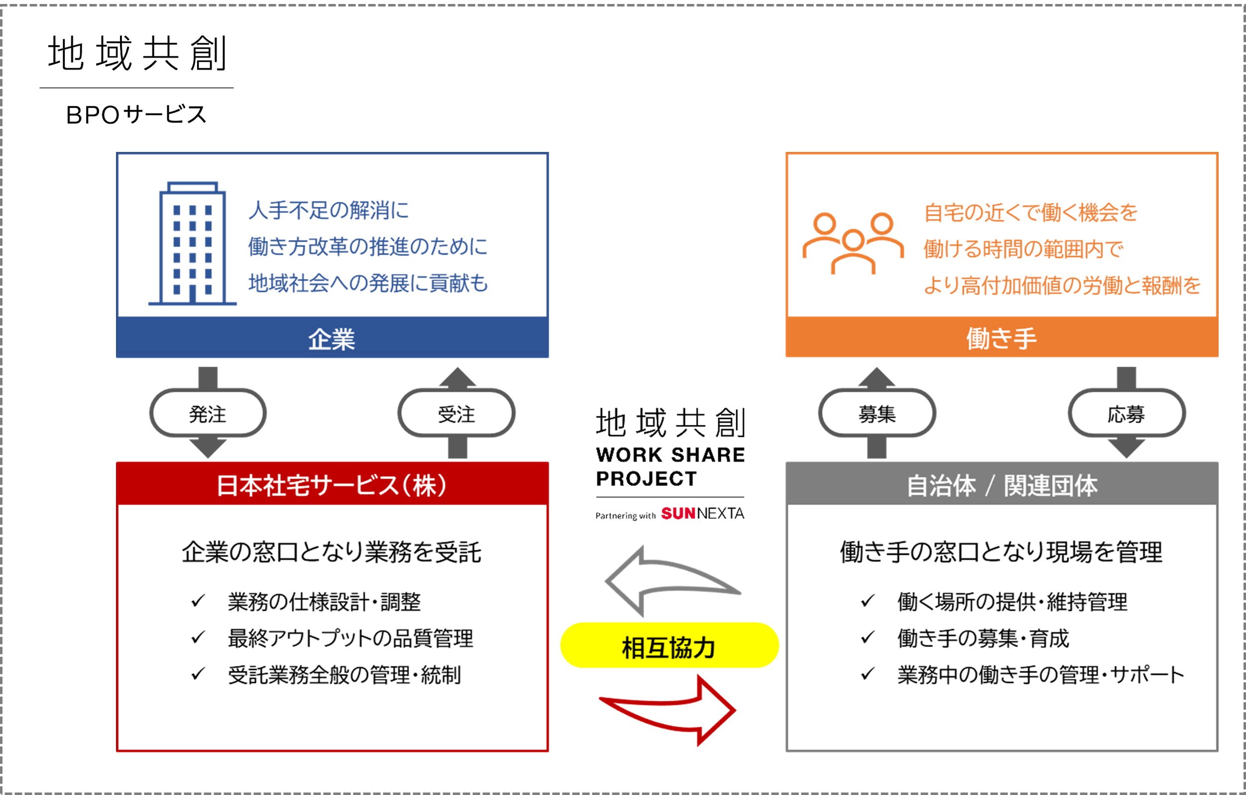 日本社宅サービスは「地域共創BPOサービス」を通して、企業が地域とともに手を取り合い、豊かに共存する新たな未来を目指します。