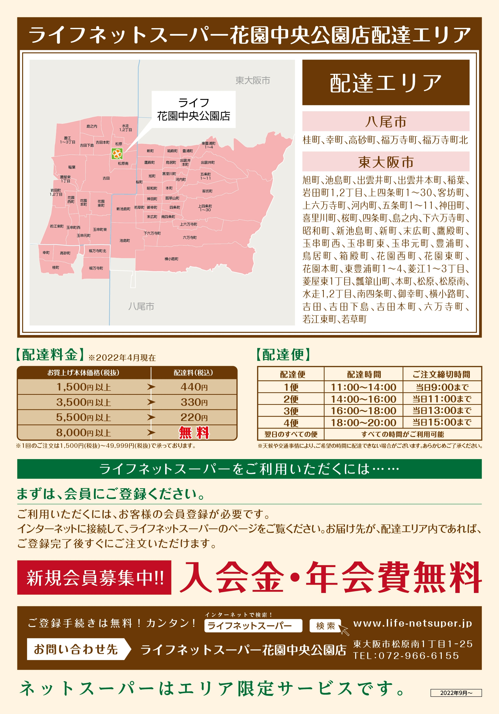 “おいしい” “ワクワク” “ハッピー” をお届けするライフコーポレーションでは、9月28日(水)より大阪府東大阪市の「ライフ花園中央公園店」で「ライフネットスーパー」のサービスを開始いたしました。これまで近隣のライフから配送していたエリアに加えて、八尾市内・東大阪市内の配達エリアの拡大が実現いたしました。