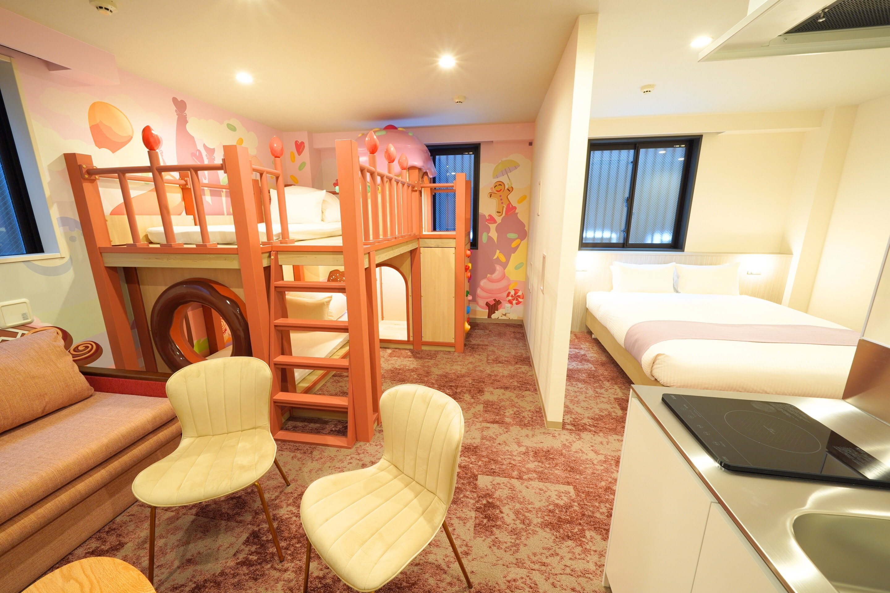 『PLAY!! RESI STAY』では、「森のお部屋」「海のお部屋」「スイーツのお部屋」の3種類のデザインの客室をご用意しました。全室定員が4名以上ですので、ご家族でゆったりとお過ごしいただけます。
