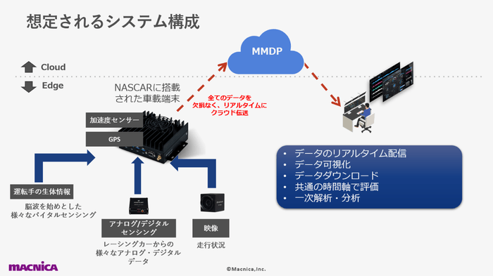 マクニカは、NASCARのスポンサードを通じ、自社の最先端テクノロジーの実証のため、データ収集を行います。オリジナルのフリートマネジメントシステムeverfleet(エバーフリート)を通じ、クラウドベースで収集した各種データを、データプラットフォームであるMacnica Mobility Data Platform(以下MMDP)に同期することを検証します。また、脳波を測定・AI解析するInnerEyeにより、極限状態のドライバーの脳波を含む生体情報を収集し、集中度、ストレス等を分析し、事故防止、快適な走行を可能にする次世代モビリティ開発に活用できるようにします。