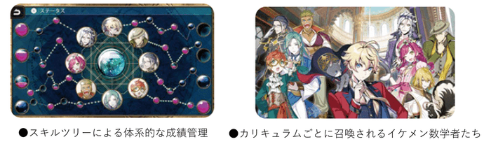 古の数学者がモデルのイケメンキャラクターの解説動画とドリルで学ぶ中学数学。好成績で見られるパーフェクトエンディングを目指します。人気声優を起用し、ゲームを進めるとキャラクター同士の会話やご褒美ボイスが聞けるなど、継続的に楽しめるゲーム設計を実現しています。