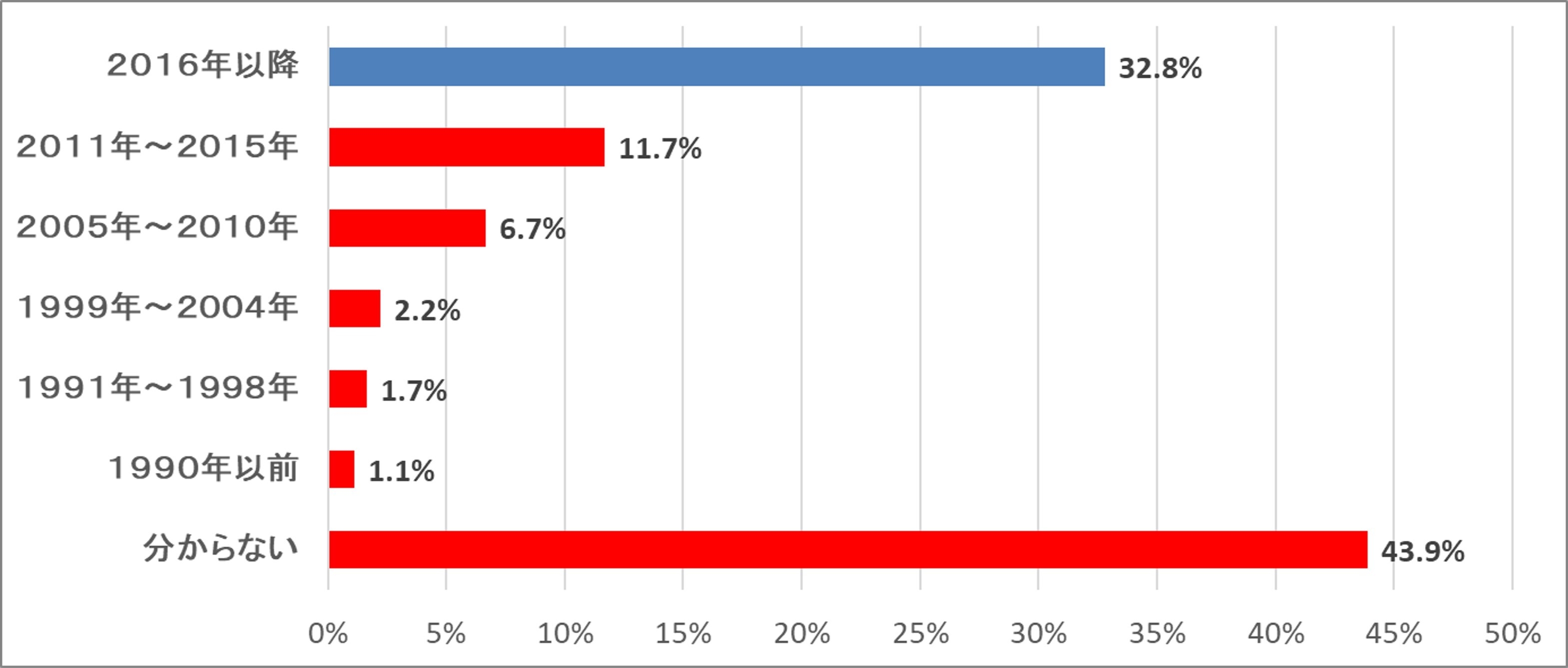 (8) 所有するカセットこんろの製造年については、「分からない」が43.9%と最も多く、4割以上が把握できていない。さらに、2015年以前の買い替え目安10年を超える古い製品を使用している人も23.3%にのぼり、3人に2人以上がカセットこんろを適切に管理できていない。