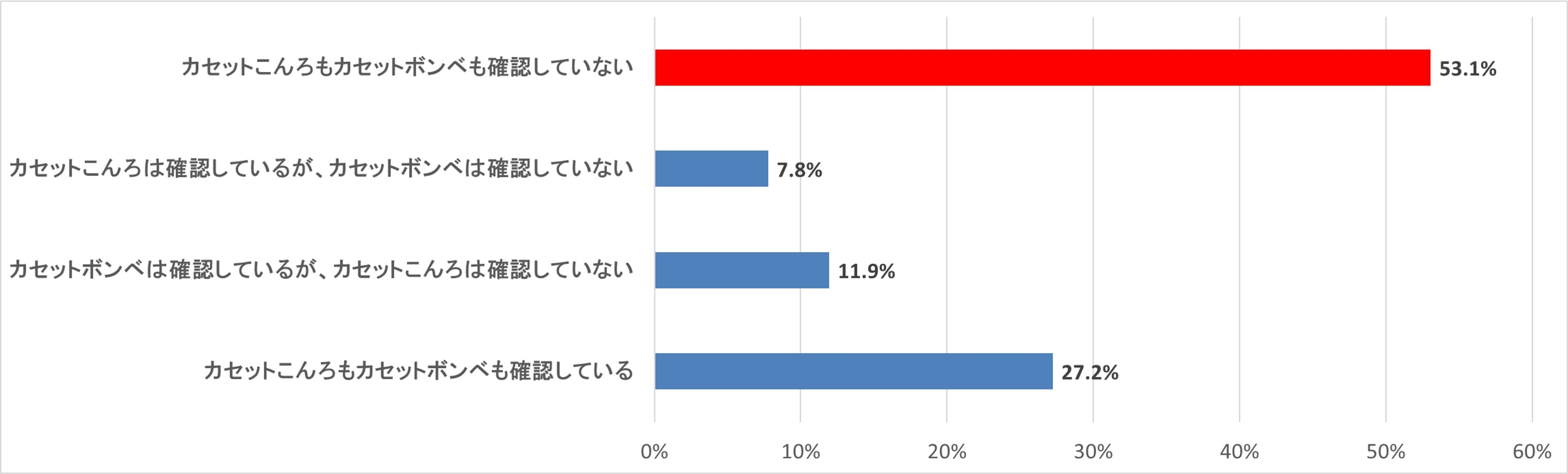 (4) カセットこんろ・ボンベの製造年の確認については、「カセットこんろもカセットボンベも確認していない(53.1%)」人が半数以上いる。