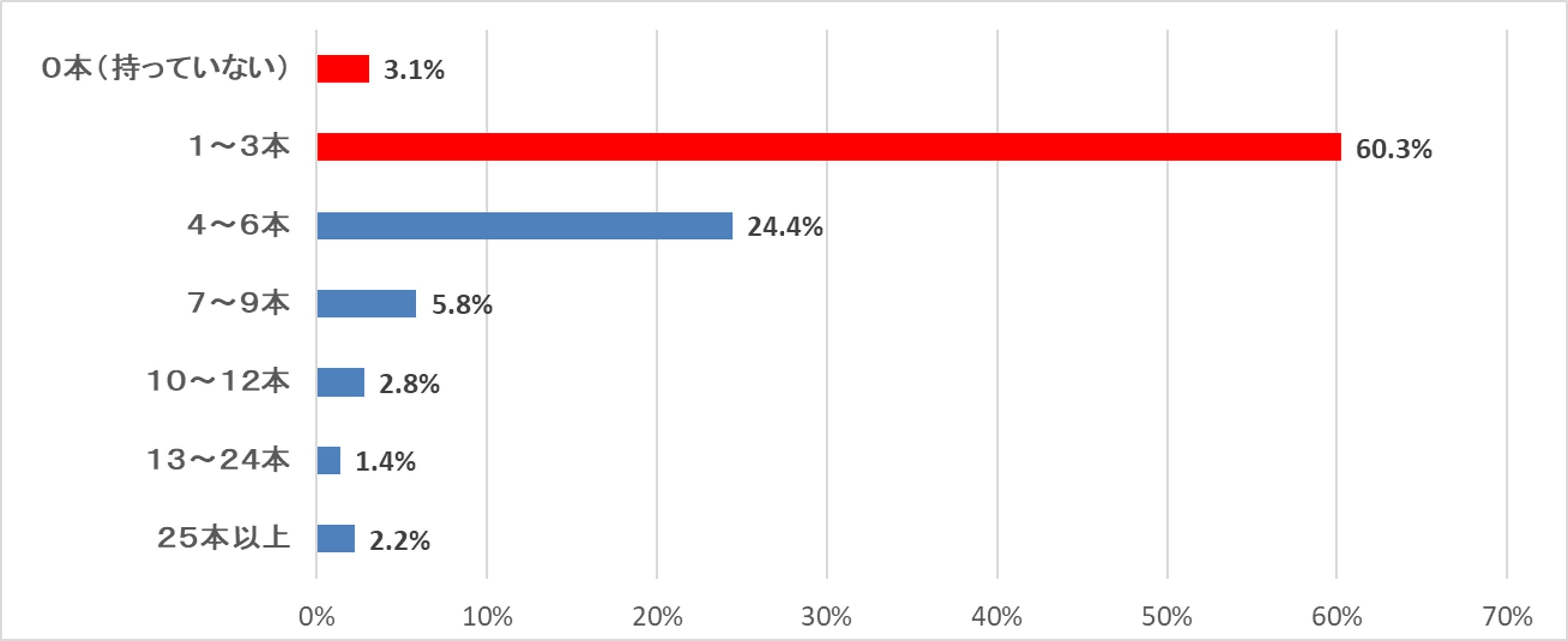(2) カセットボンベの所持数に関しては、「1~3本」が最も高く60.3%、「0本(持っていない)」は3.1%(昨年は5.8%)となり、昨年の同調査と比べて持っていない人は約半減するなど改善が見られた一方で、政府推奨(※)の「1人1週間当たり約6本」を備えている人は少数。