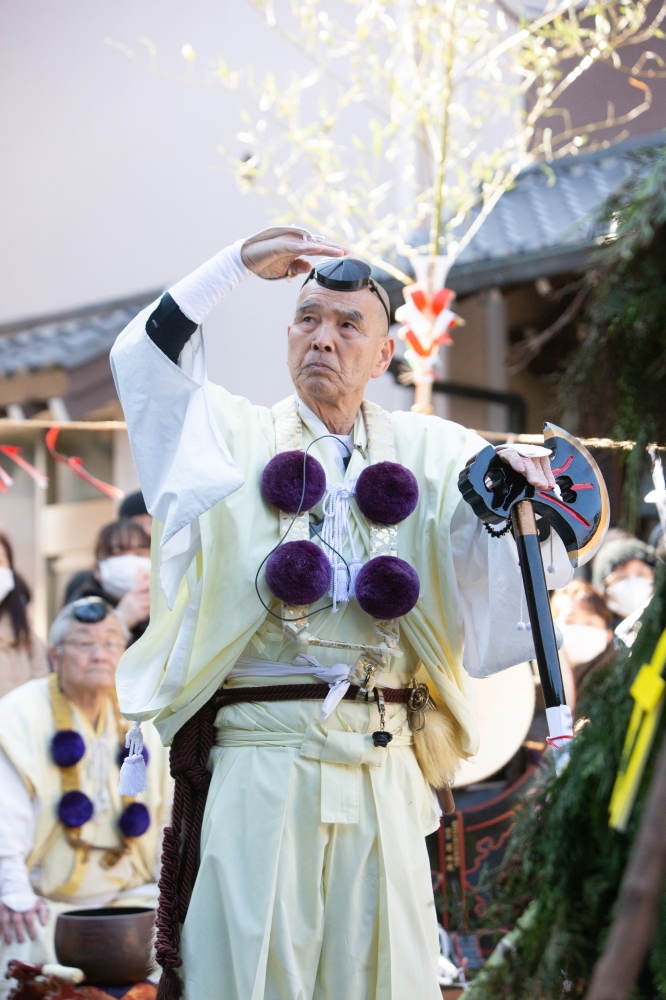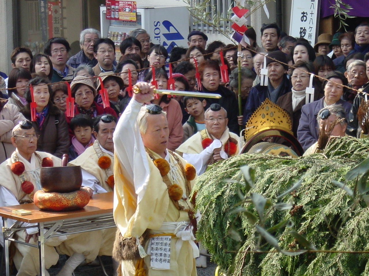 「護摩木(ごまぎ)」とよばれる木の片を不動明王の智慧の炎で燃やして、その年の厄除けと無病息災を祈る伝統儀式です。修験道の道を極めた山伏たちが、伝統作法にのっとり弓や剣や斧を奉納する儀式を修めたのちに炎を護摩壇に点火します。高らかにあがる炎は人を魅了するものがあります。