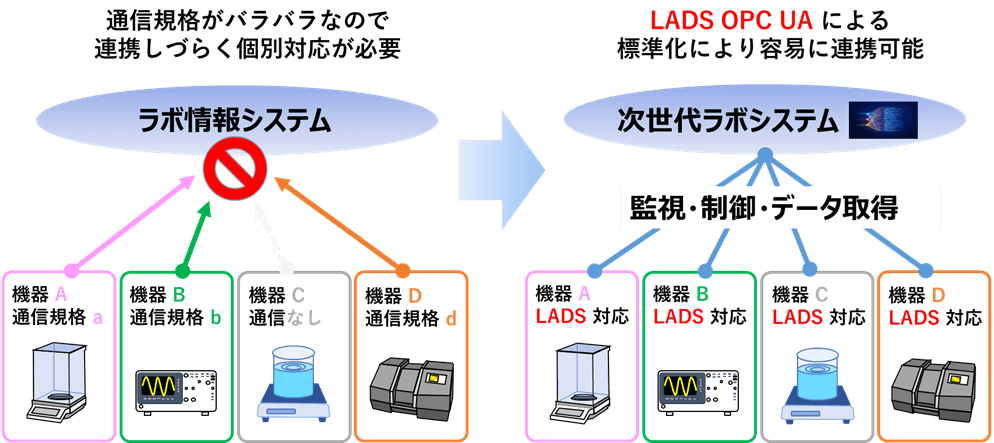 両者は、これらのボトルネックを取り除き、ラボのDXをより推進するため、国内初となるラボ用機器の通信および相互運用規格の適用に向けた取り組みを行い、LADS OPC UAの早期普及を目指します。LADS OPC UAを導入し、多くの実験機器をプラグ&プレイ※3でつなぐことで、容易かつセキュアに実験機器の遠隔監視・制御やデータの取得蓄積が可能になります。さらに、複数の実験機器や研究者間の効率的な連携も可能となるため、自動化にかかる時間やコスト、技術的な制約を減らせます。