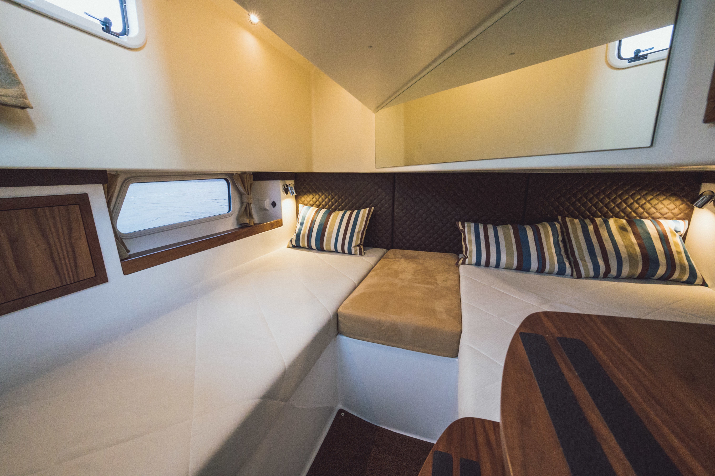 今回日本にやってくるNord Star28+と31+は、Nord Starの定番とも言える箱型のパイロットハウススタイル。走りはもちろん、注目いただきたいのはその丈夫さです。積層は15層と厚く、硬化には必ず3週間をかける丁寧なモノづくりは北欧ならではのこだわりであり、全て職人の手業で行われています。