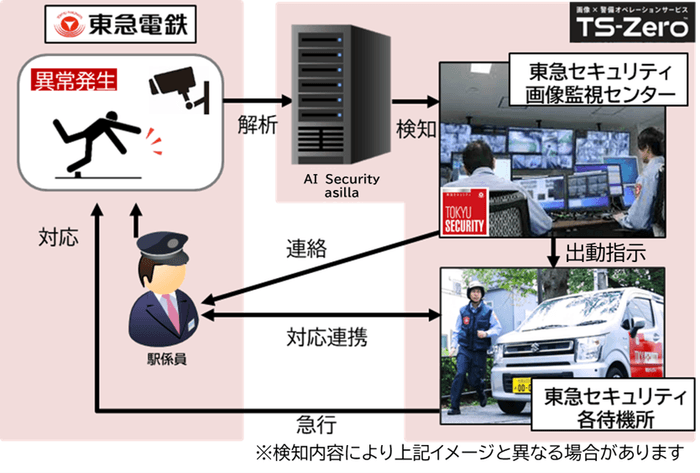 「TS-Zero(R)」では、アジラのAI警備システム『AI Security asilla(以下、『asilla』)※2』によって駅構内で発生したお客様トラブルや転倒・長時間の滞留を検出した映像を、東急セキュリティ画像監視センターで監視員が確認を行い、必要に応じて駅係員と警備員が連携して速やかに対応することで安全性とお客様サービスの向上を目指します。
