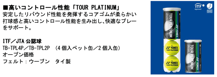 ヨネックスは自社テニスボール工場をタイに持ち、そこで生み出される製品は、安定した飛び性能と高い耐久性を誇り、世界のトップ選手からも厚い信頼を得ています。昨年度は東レ パン パシフィック オープンテニストーナメントをはじめ数々の大会でオフィシャルボールとして採用されました。今回、ITF/JTA公認球である「ツアープラチナム」がアジアを代表するATPツアーの3大会においてオフィシャルボールとして採用されたことは、その品質と性能が国際的に高く評価された証です。