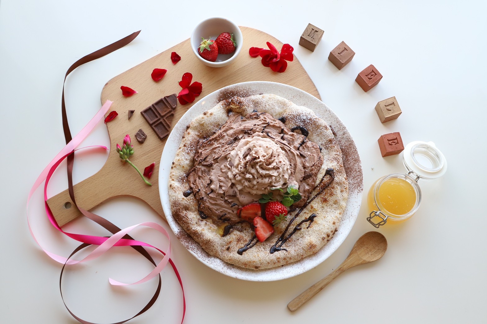 ミエレではバレンタインにあわせて期間限定の新メニュー「バレンタインwithエスプーマチョコレート」と「ミエレオリジナル モカ/モカホワイト」の販売を開始します!「バレンタインwithエスプーマチョコレート」はもちもちのピザ生地に相性抜群のたっぷりのチョコレートクリームをのせたデザートピザ!旬のいちごが添えられた、フレッシュな甘酸っぱさがアクセントになっています。オリジナルドリンクはやさしい甘さのホワイトクリームの「ホワイトモカ」とチョコクリームの「モカ」の2種類から、好みにあわせて選べます。バレンタイン気分を盛り上げる特別メニューを是非お楽しみください。