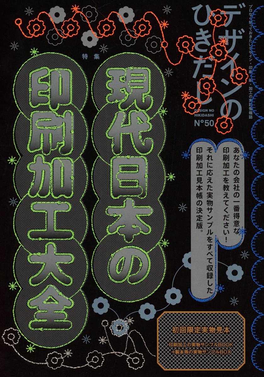そこで、「デザインのひきだし50号・超突破記念フェア」と銘打ち、印刷や紙加工からさらに発想を広げ、紙を糸で縫う“刺繍”という表現方法を使った50号表紙や、特集「現代日本の印刷加工大全」と連動した50号別冊サンプルBOOKに綴じ込まれた実物サンプルなどを展示します。