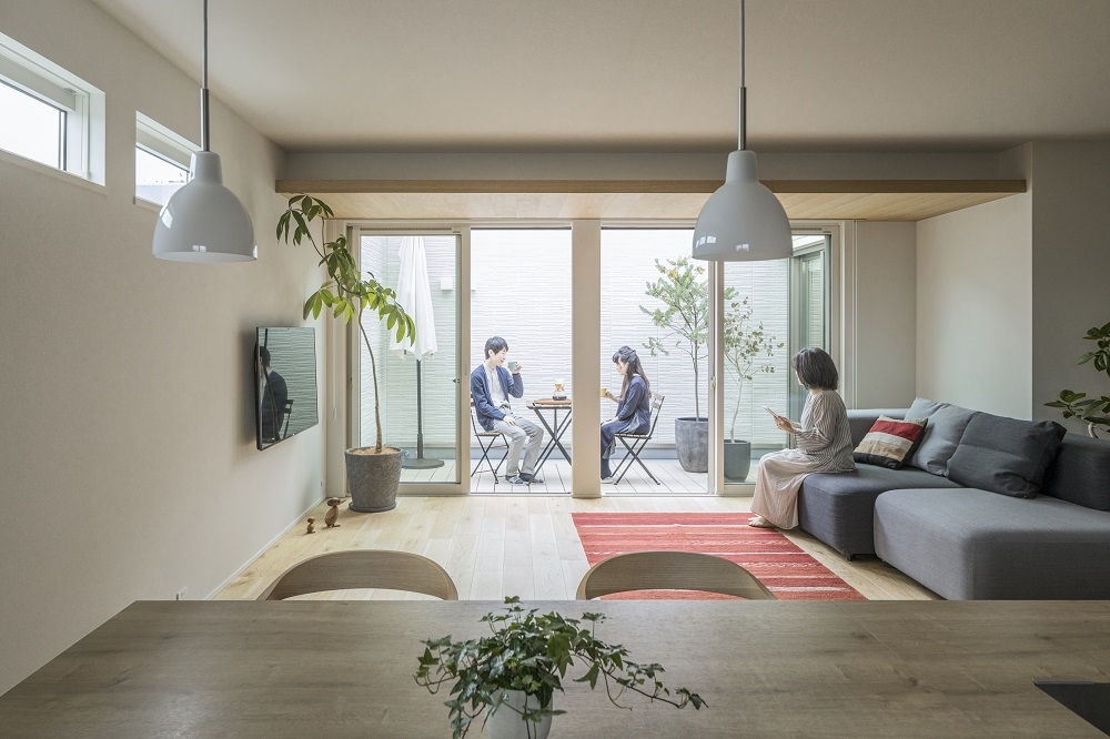リビングは、愛犬が最もよく過ごすスペース。2階の部屋数を少なくしたことで、広いリビングを実現しました。リビングの先には、奥行のある広々としたバルコニーがフラットにつながります。外からの視線に配慮して高めの袖壁を立てた一方、採光のために屋根は設けておらず、プライバシーと開放感を両立させました。