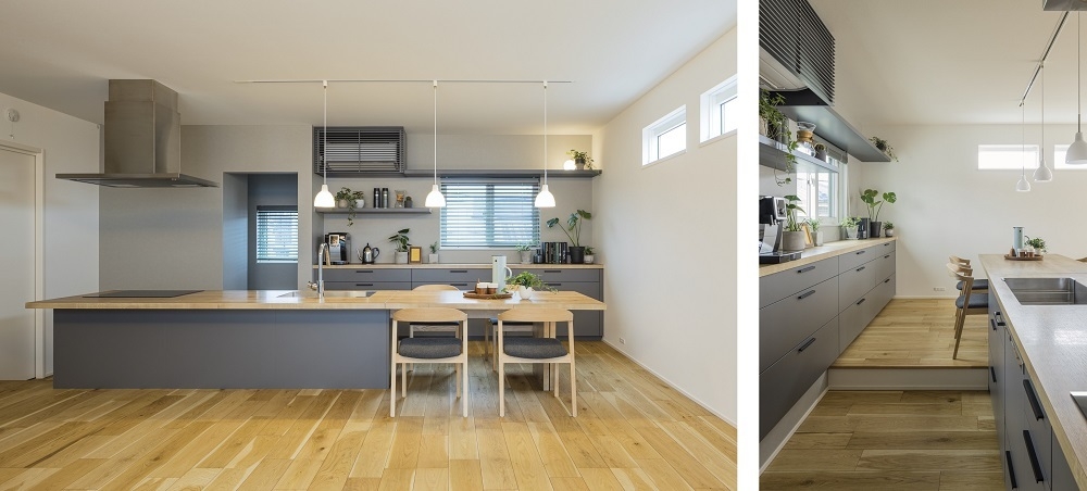 2階のLDKは妻・Kさんの好みに合わせ、やさしくてグレイッシュな雰囲気とシンプルなインテリアにまとめています。ダイニングテーブルをキッチンと横並びにして高さを揃えたいという要望を叶えるため、キッチン内部以外の床を全て上げる設計をしました。また、冷蔵庫や電子レンジなどの家電はパントリーに入れ、すっきりとした印象に。