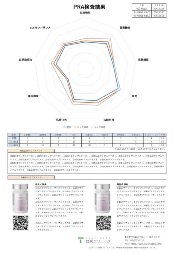 検査後には、免疫医療の専門家で日本における酵素栄養学の第一人者で知られる鶴見医師による、検査結果からの診断とアドバイス(3回コースでは初回と3回目)、お勧めのサプリメントについて、メールまたは郵送にてお送りします。