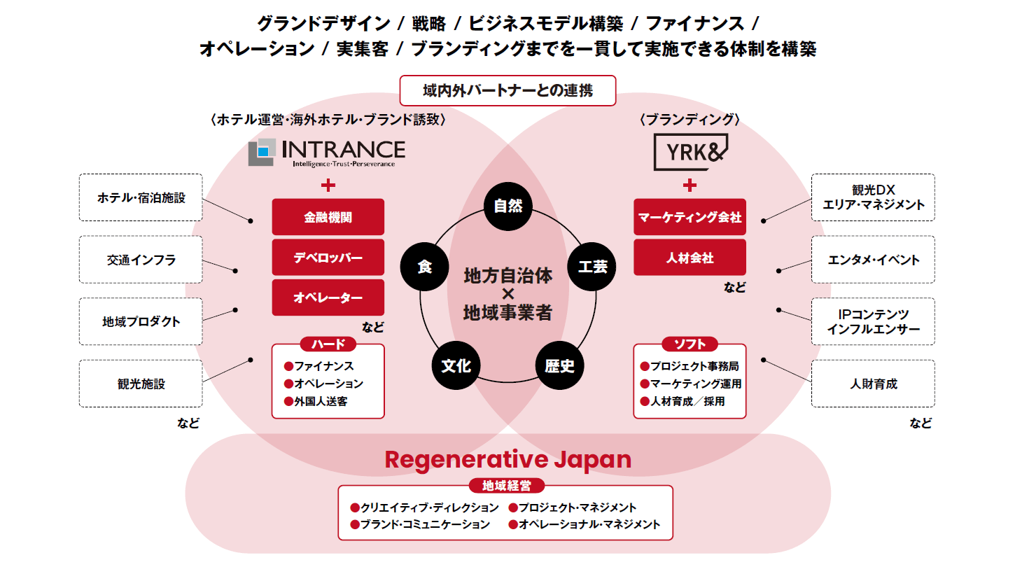 株式会社YRK andは、1896年の創業以来129年にわたり、クライアントの持つ価値を最善の形で世の中に伝える「リブランディング支援」を専門としてきました。この豊富な経験と知見を活かしながら、この「地域事業創成」プロジェクトでは、YRK and単独ではなく、リジェネラティブ・ジャパン、及びイントランス(ホテルブランド誘致、宿泊・飲食オペレーション等を手掛ける専門会社)がタッグを組み、それぞれの強みを最大限に活かし、連携することでプロジェクトを強力に推進します。