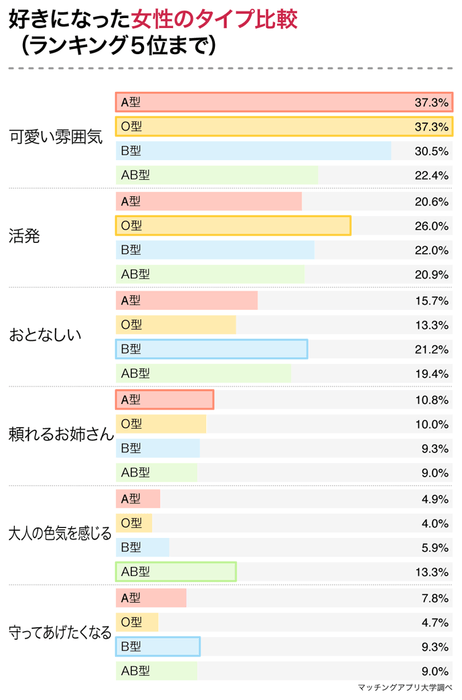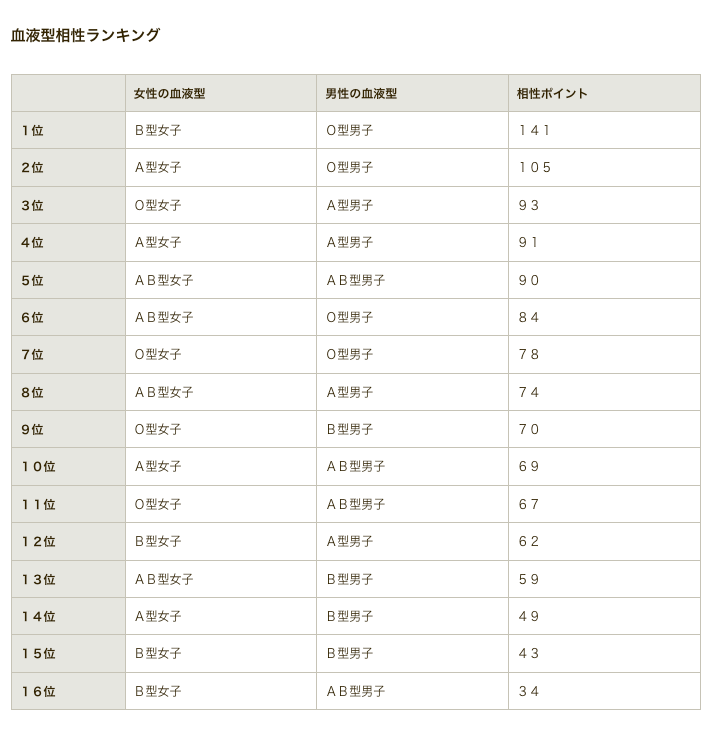 A型女子はO型男子、O型女子はA型男子、B型女子はO型男子、AB型女子はAB型男子がもっとも相性が良い相手という結果でした。