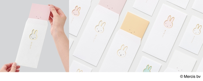 『窓ぽち袋 ミッフィー』『窓のし袋 ミッフィー』は、ミッフィーの可愛らしさとともに、シリーズの特徴であるユニークな仕掛けで楽しさを贈ることができるぽち袋とのし袋です。ミッフィーの形に窓があいた封筒から添紙を引き出すことでミッフィーの表情や色が変化します。気持ちを贈るだけでなく、ミッフィーの表情の変化で相手との楽しいコミュニケーションを生み出します。