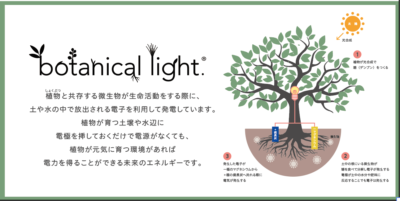 植物が育つ土壌や水辺に電極を挿しておくだけで電源がなくても、植物が元気に育つ環境があれば電力を得ることができる未来のエネルギーです。