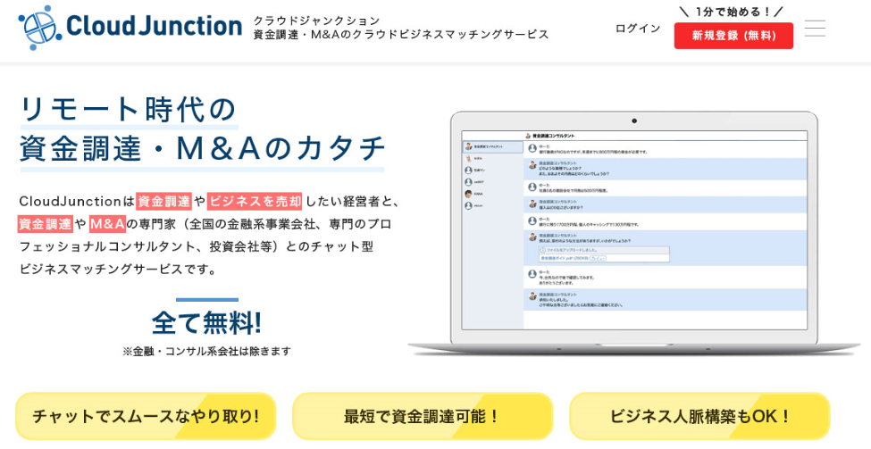 CloudJunctionは、コロナウイルスの影響等で資金繰りに困っている事業者や、自社のビジネスを譲渡したい経営者が、全国の金融系会社や専門コンサルタント、投資家とチャットでやり取りが可能なビジネスマッチングサービスです。