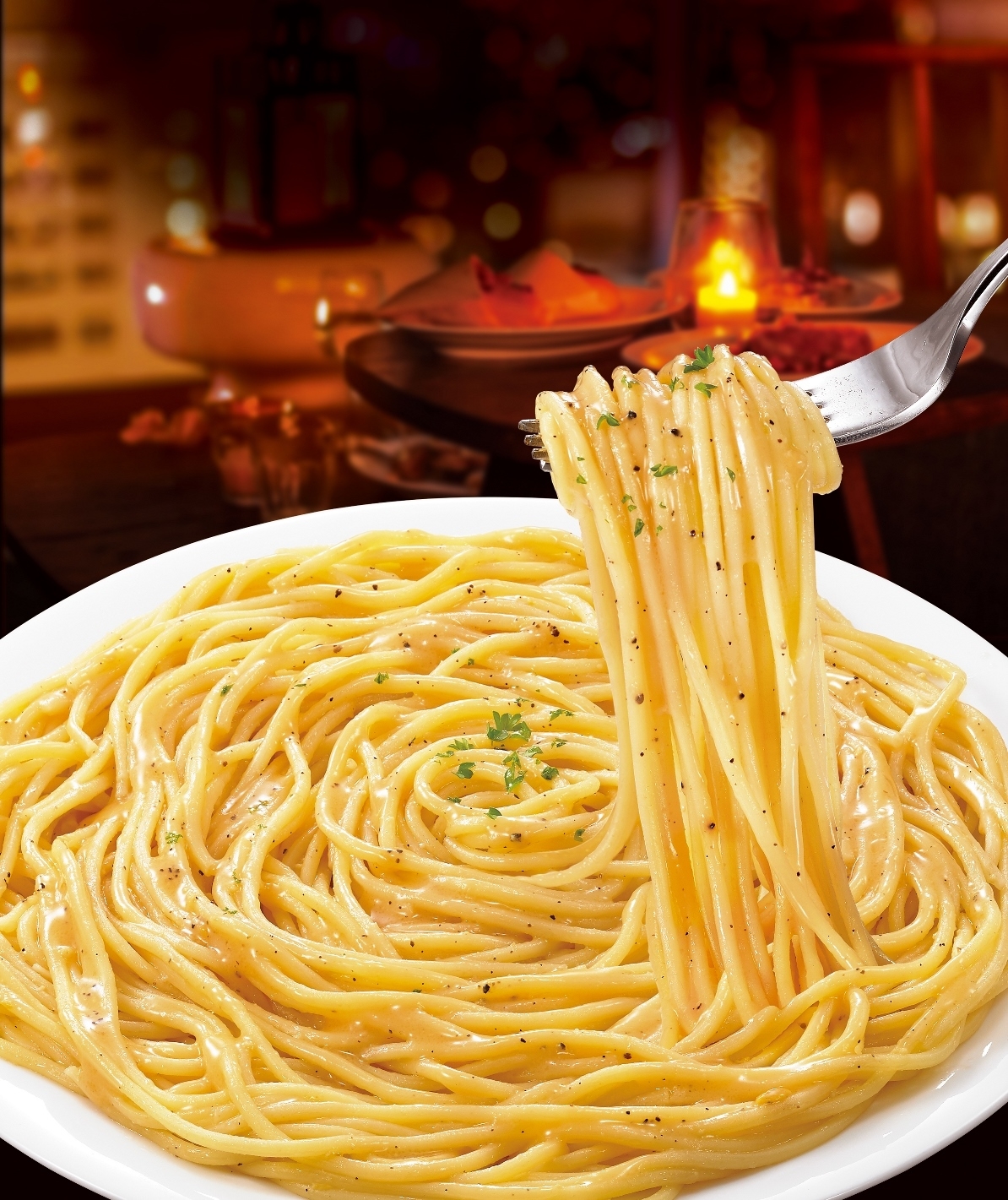 かんたんまぜるだけ!卵のまろやかなコクと濃厚なチーズの風味にベーコン風味をプラスした、黒こしょうがアクセントのカルボナーラ風ソースです。