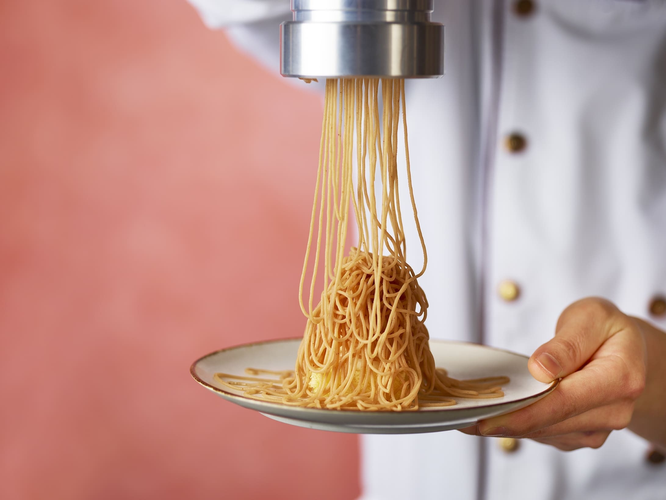 目の前でパティシエがサービスするいちご味のモンブラン。甘酸っぱいいちご風味のペーストをたっぷりと搾ります。