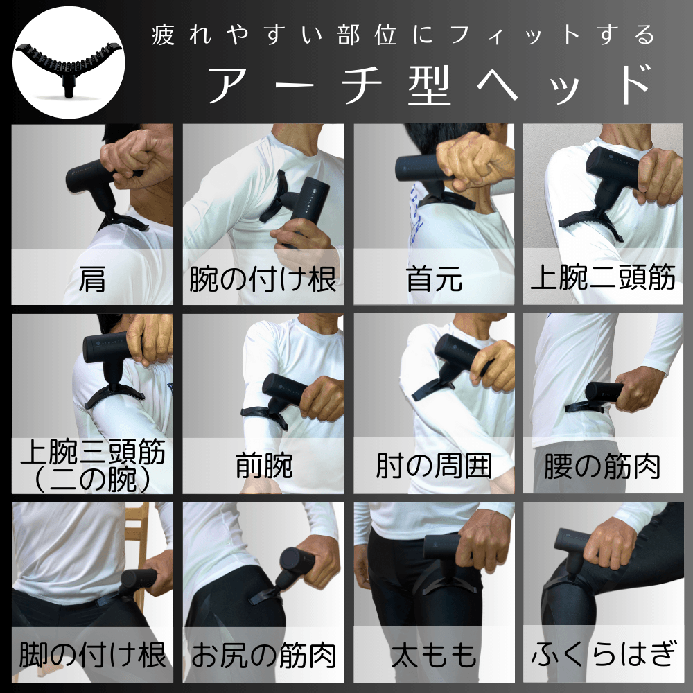 一般的なガンタイプのアイテムはピンポイントに刺激するヘッドのみが付属されていますが、YaWaRa ATHLETEは『疲れやすい筋肉は丸みを帯びている』ことに着目し、筋肉を包み込むような“アーチ型ヘッド”を採用し、一度に広範囲に刺激を与えることができます。