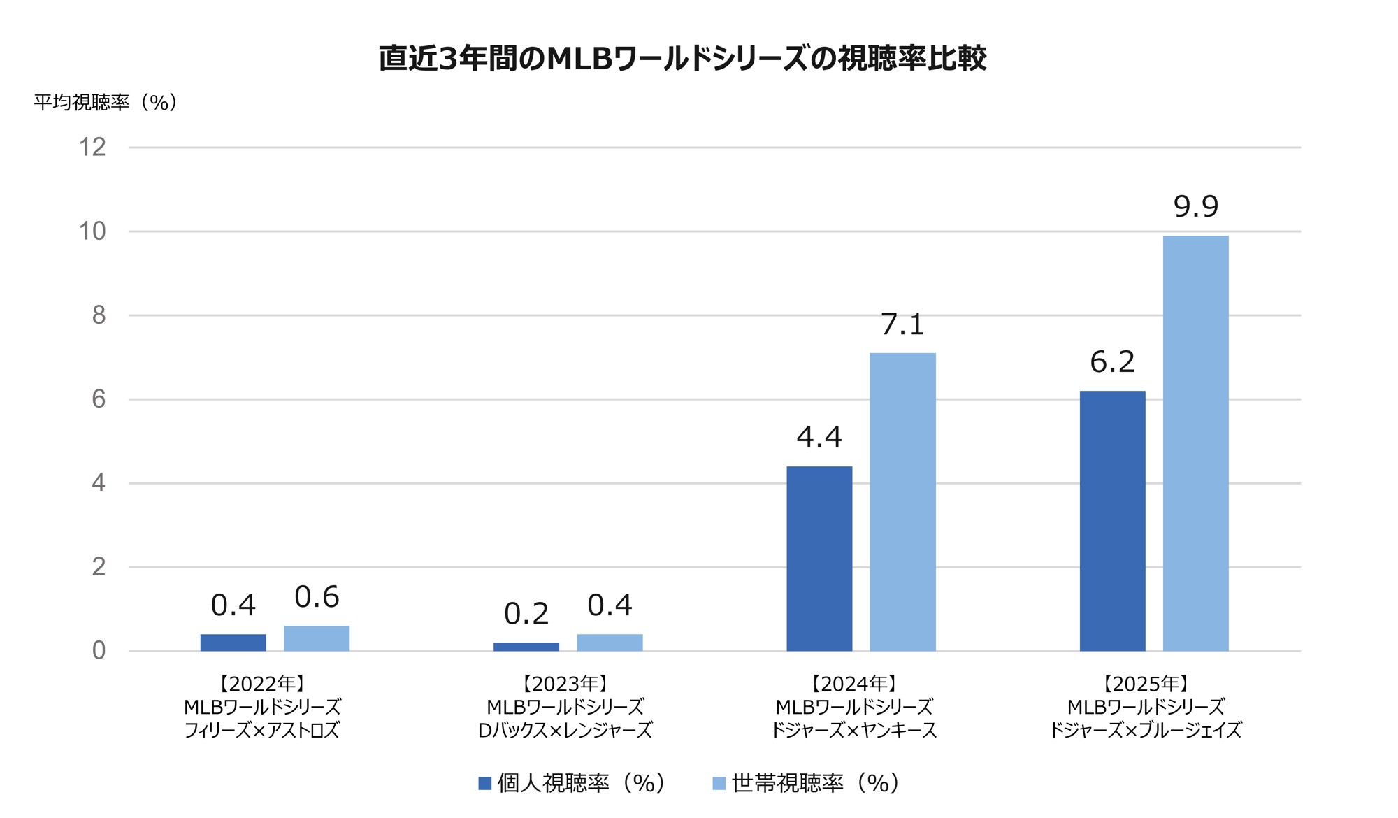 データを見ると、ドジャースがワールドシリーズに進出した2024年と2025年の視聴率が際立って高いことがわかります。特に今年2025年は、個人視聴率6.2%・世帯視聴率9.9%と過去4年間で最も高い視聴率を記録しました。