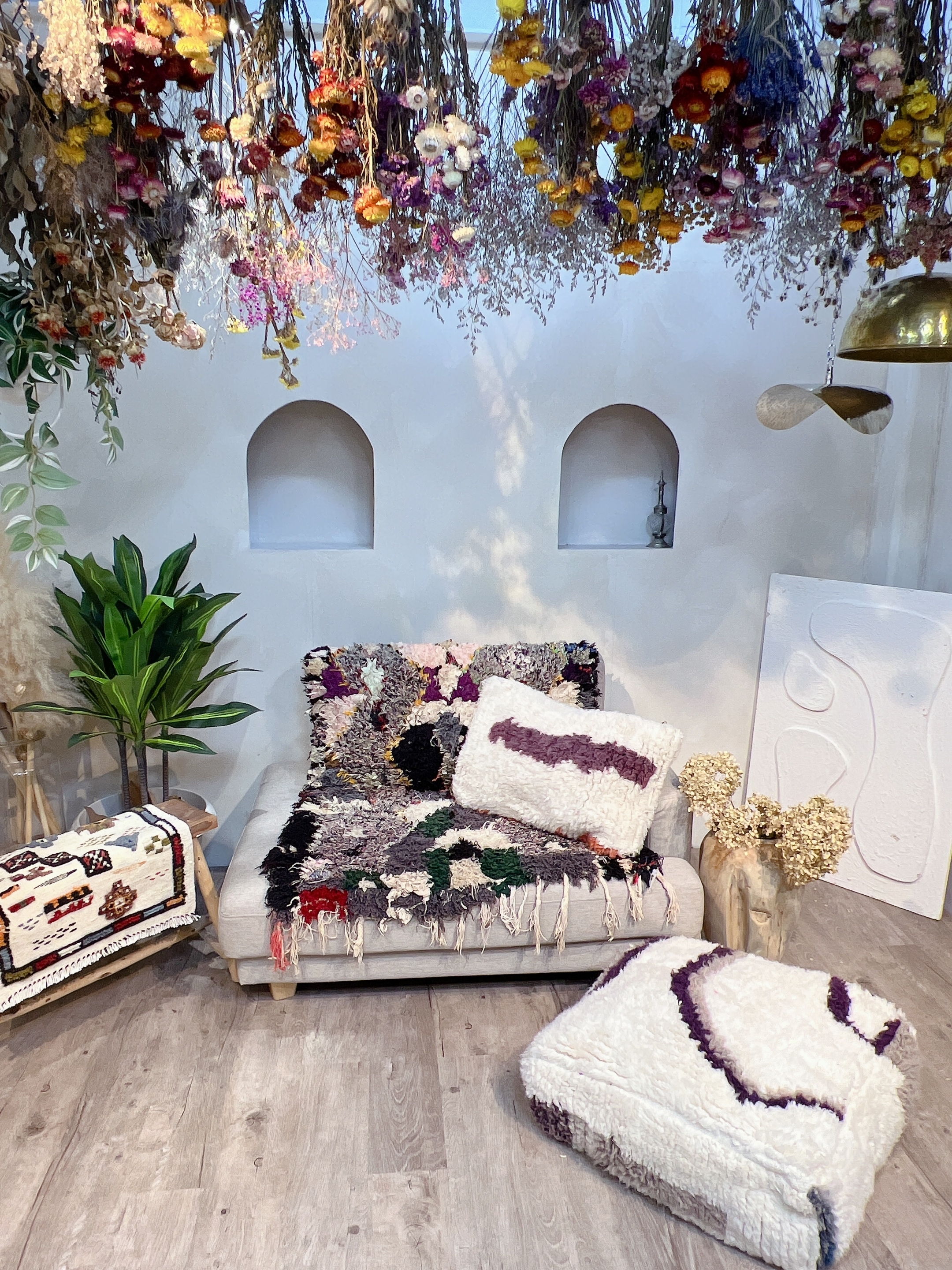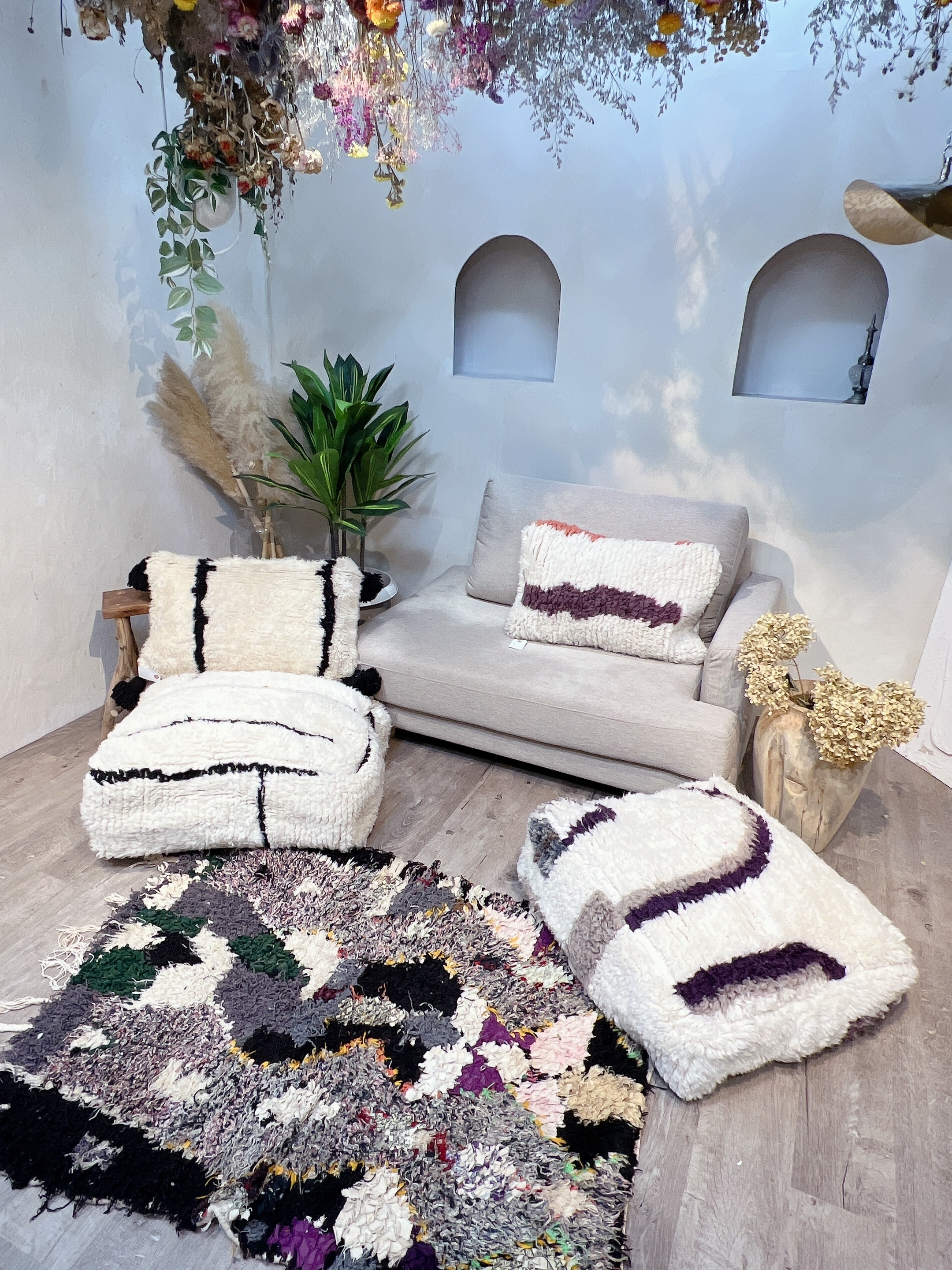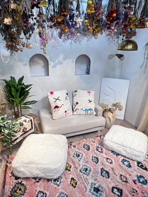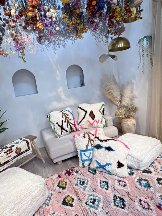 春の模様替えや新生活に向け、世界に一つだけの、モロッコ女性による手織りの温もりあふれるインテリアが登場します。手織りのモロッコラグだけでなくラグをリメイクしたプフやクッションも販売します。