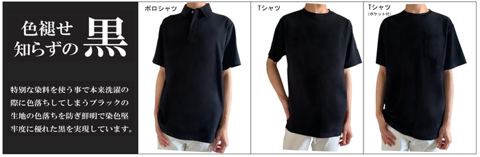 この度発売する『色褪せ知らずの黒 Tシャツ・ポロシャツ』は、合成繊維を使用するのではなく、綿100%でありながらも、特殊な染料を使用することで“色褪せ知らずの黒”を実現しています。また、流行に左右されないシンプルなデザインとなっているため、さまざまなシーンで着用いただけます。