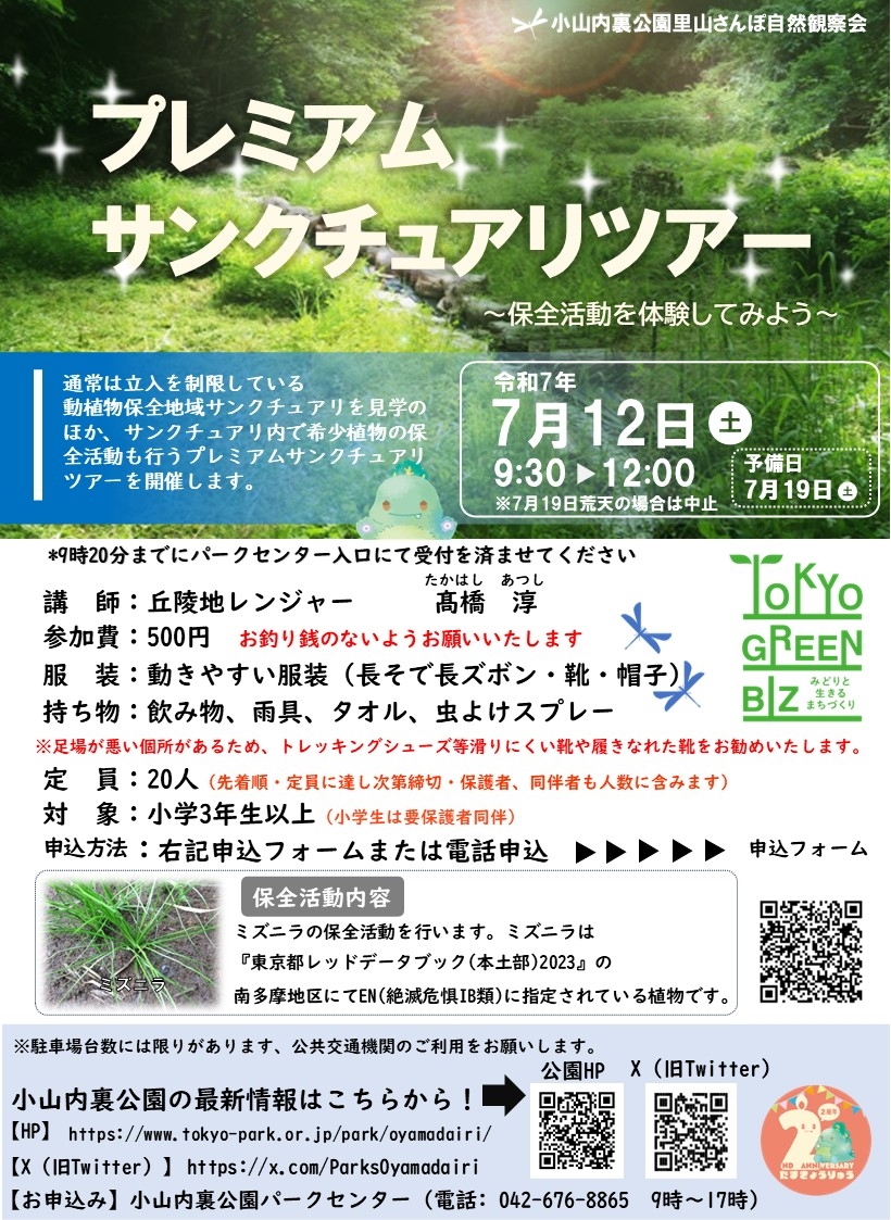小山内裏公園では、通常は立入を制限している動植物保全地域「サンクチュアリ」を見学できる「プレミアムサンクチュアリツアー」を7月12日(土)に開催いたします。