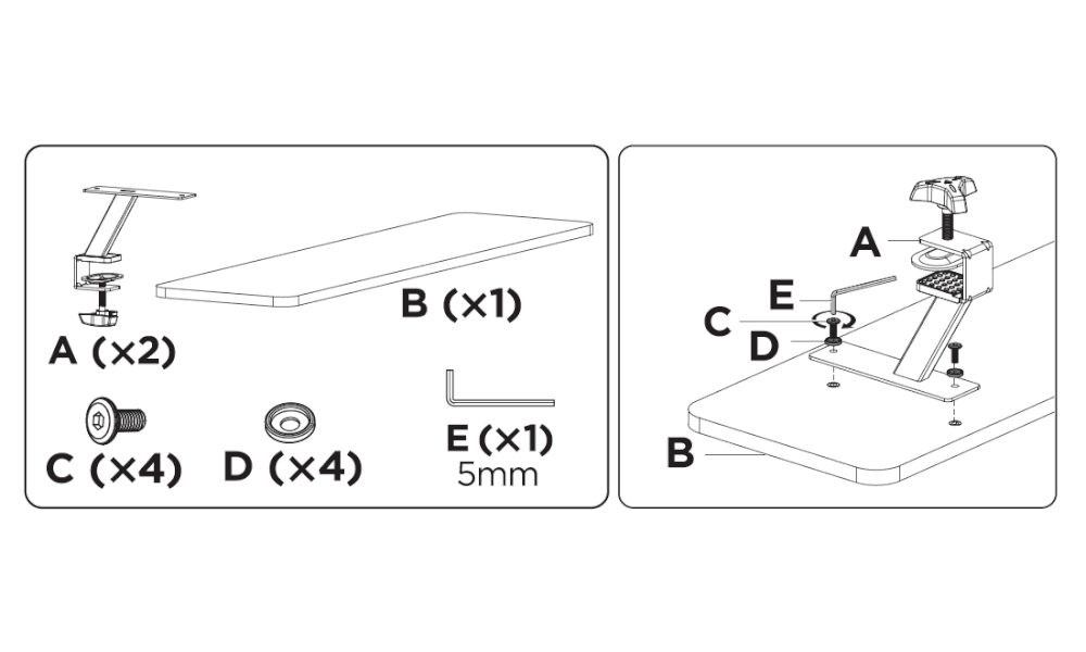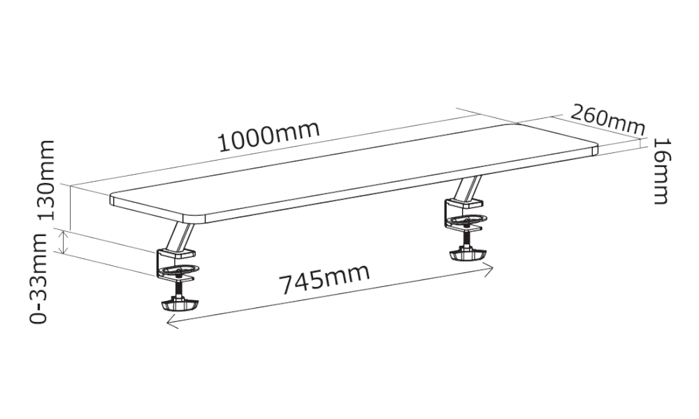 天板サイズ:1000×260×130mm、天板の厚み:16mm、クランプ取り付け可能サイズは、厚さ最大33mmになります。「ボード(天板)」と「クランプ(取付金具)」および、デスクへの取り付けは、付属のネジ類・工具(レンチ)のみで設置が可能なため、別途、工具を買う必要はございません。