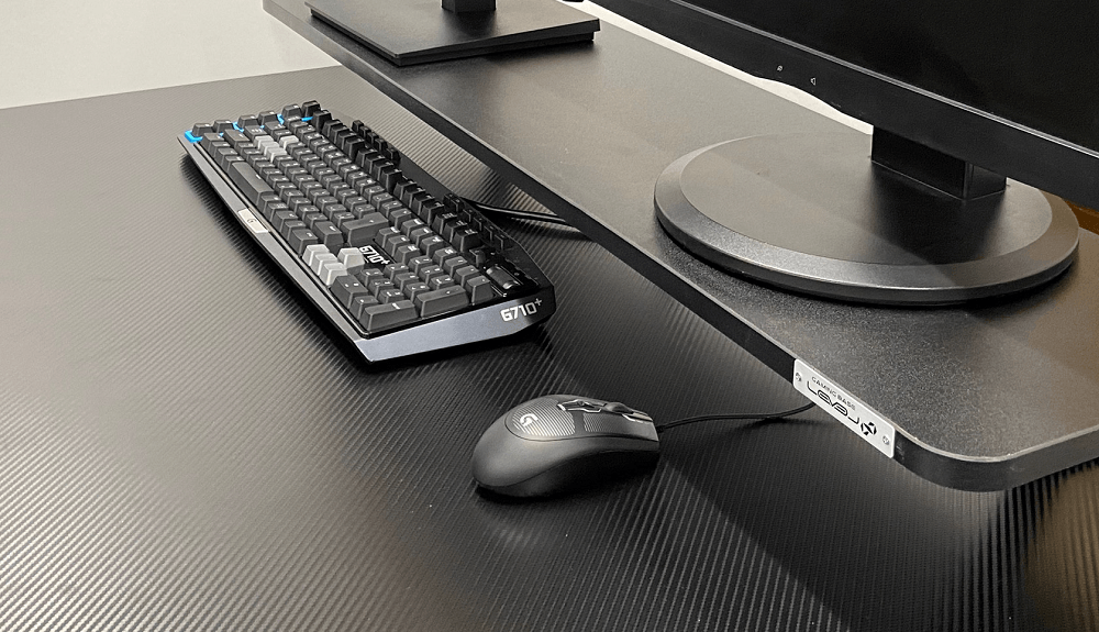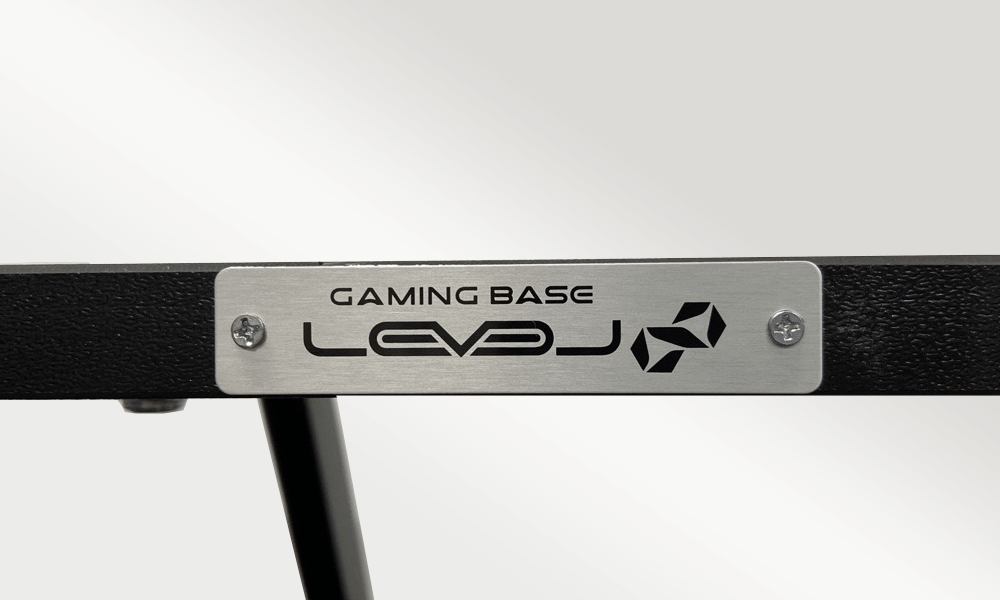 また、モニタースタンド下にスペースができるのでマウスやキーボードなどを置く事ができます。向かって右側の天板の縁には、当社、iiyama PC ゲーミングPCシリーズ「LEVEL∞(レベル インフィニティ)」のロゴプレートがあしらわれています。