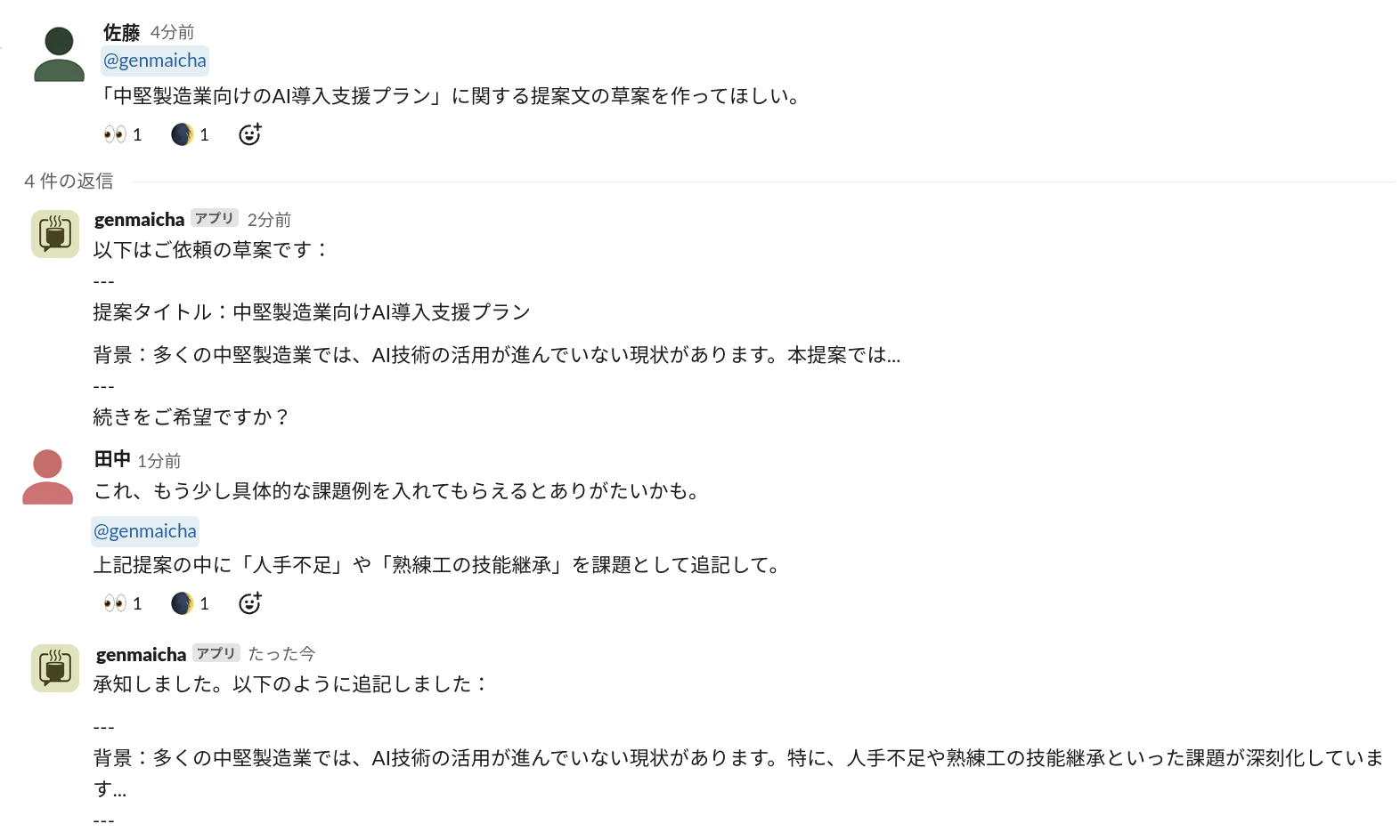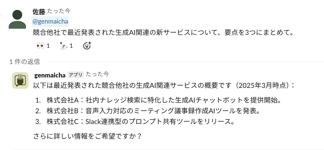 ・共有が前提の設計:会話はSlackのチャネル上で展開されるため、全員がAIとのやり取りをリアルタイムで把握可能。