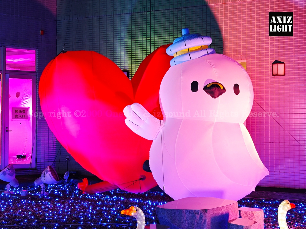 今回の演出ではプロ仕様の演出ライトアップから、高詳細演出のプロジェクション演出ロゴ、シンプルでありながら差をつける高輝度イルミネーション、オリジナル製造の3D大型バルーンなどなど、独自の演出製品を自在に使用し、空間全体の魅力と邑楽町やオーランドさんの良さを存分に発揮させるデザインに。