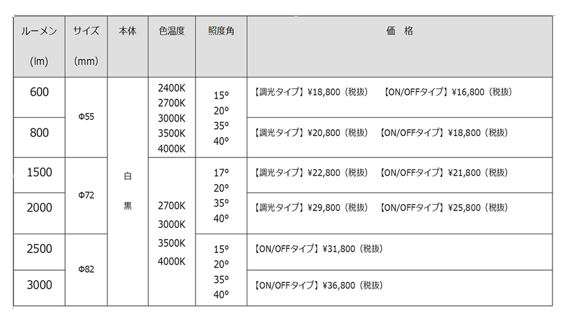 この度の新製品は、「X-Pro」シリーズのコンセプトである光の質にこだわり、「フレアレス」(バラつきのない光)をスポットライトでも実現しました。ラグジュアリーな空間からデザインオフィスなどさまざまな空間、多様なシチュエーションで活用いただけるよう、6種類の明るさ(光束/600、800、1500、2000、2500、3500ルーメン)でこのうち600、800、1500、2000ルーメンクラスは調光タイプを品揃えし、明るさに合わせて3種類のサイズ(直径(Φ)55ミリ、72ミリ、85ミリ)をご用意。また、色温度は2700K、3000K、3500K、4000Kを揃え、600、800ルーメンクラスには2400Kも加えております。