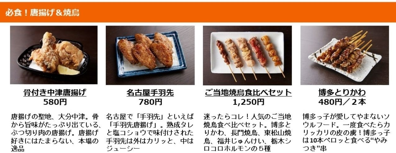 「餃子」「ラーメン・うどん」「焼鳥」「唐揚げ」「やきそば&スパゲッティ」「丼・めし・カレー」「一品」「おにぎりサンド・ソフトクリーム」「ドリンク」の店舗を設け、各地の代表的な郷土料理はもちろん、産直食材や、地域でおなじみのB級グルメ、どんぶり、麺などのソウルフードまで、手づくりの料理をカジュアルに提供します。ご当地サワーや地酒、懐かしのクリームソーダも楽しめます。駅ナカにいながら日本全国の味を食べつくせます。