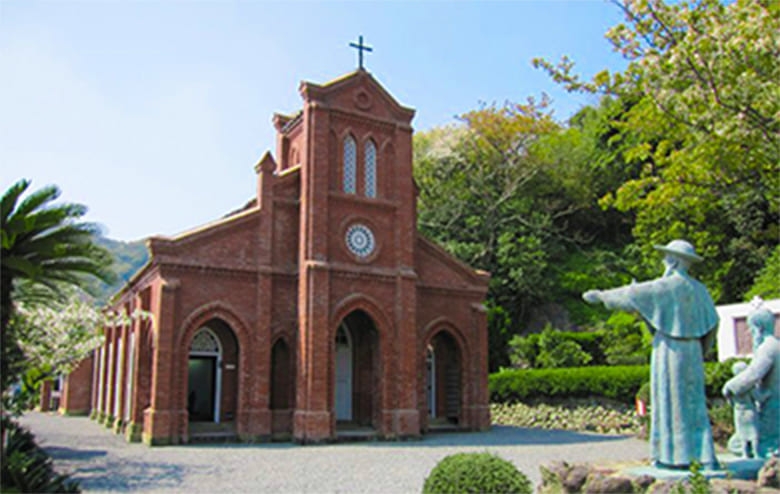 赤レンガのゴシック様式の天主堂内には、現在キリスト教弾圧時の様子をうかが える資料が展示され、資料館として残されています。教会前の広場は縄文時代前期の堂崎遺跡でもあり、冬から春頃にかけてマングローブ植物のハマジンチョウが可憐な花を咲かせています。