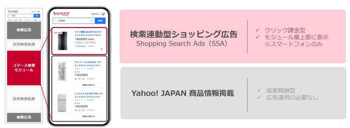 Yahoo!広告「検索連動型ショッピング広告」は、Yahoo!検索で商品情報などを検索した際にスマートフォンで表示される「コマース検索」モジュールの最上部に商品情報を掲載できる広告です。最上部でさらに強く商品をアピールできます。