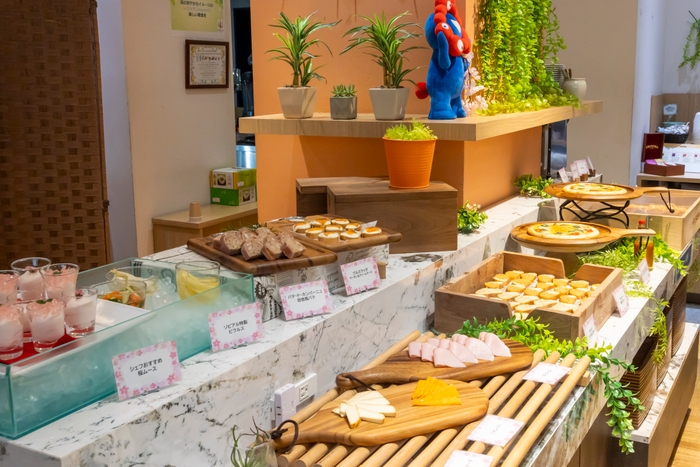 すりたての生ハム、焼き立てピザ、カポナータ、カマンベールフライ、ミニラザニア、トマトとバジルのカッペリーニ、シークワーサー香るトマトパスタ、ブルスケッタ(カプレーゼ風)、カナッペ(ガーリックバター・明太子バター)、シェフのおすすめ(マグロとアボカドのインボルティーニ)、ソビアル特製 ピクルス、サラダ各種、パン各種、ビシソワーズ、苺ムースタルト、マロンケーキ、抹茶羊羹、雪塩キャラメルプリン等