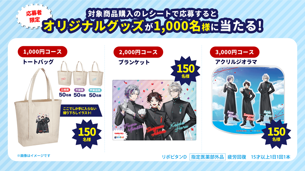 みなさまのファイトを応援するリポビタンと、応援団姿で皆さんを応援する三枝さん、不破さん、甲斐田さんとの貴重なコラボをぜひご体験ください。