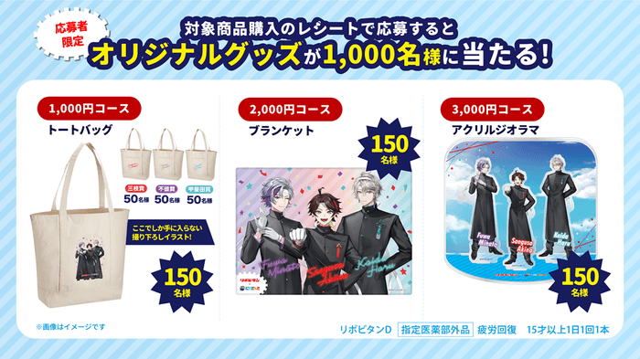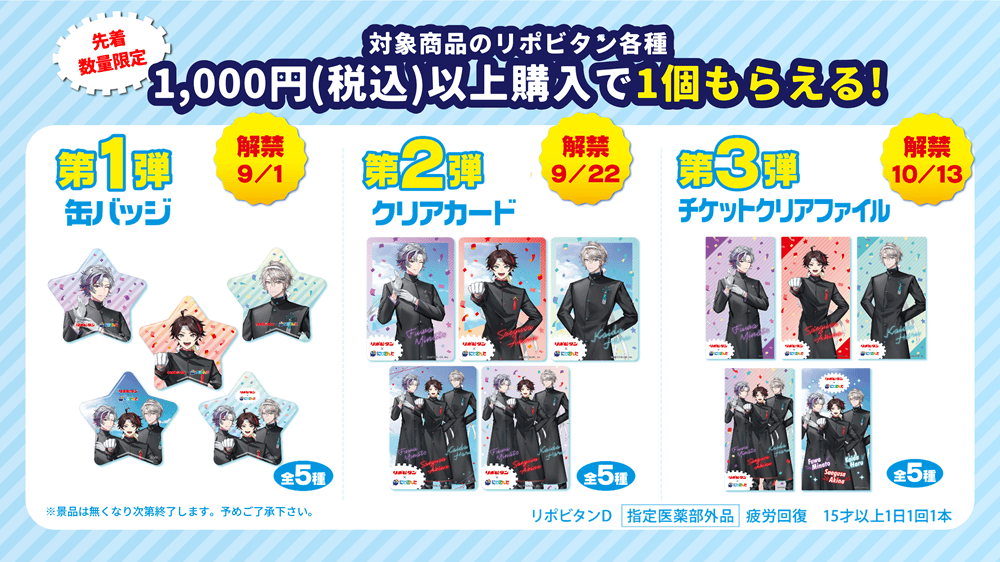 対象商品のリポビタンを1,000円以上ご購入で、限定グッズをプレゼント!今回の限定グッズは、なんと3つの期間ごとにグッズがもらえます。グッズは無くなり次第終了となりますので対象店頭を要チェック!