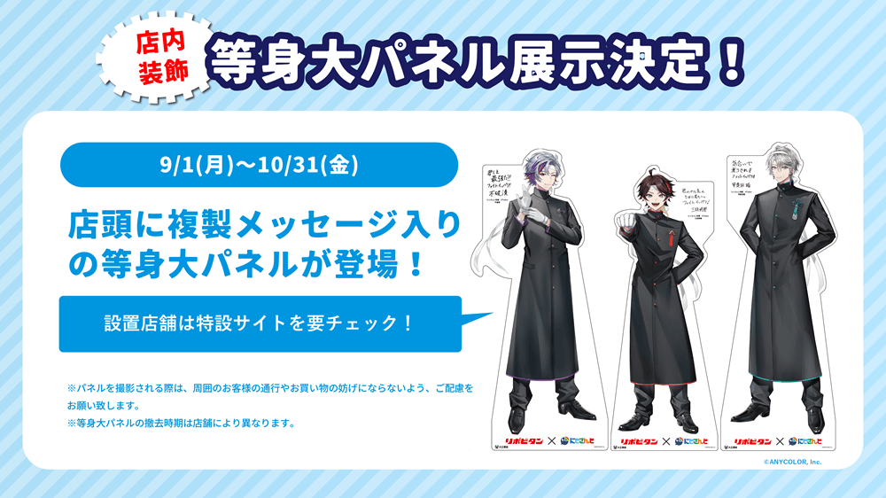 「リポにじ応援祭」では、対象商品のご購入でオリジナルグッズがもらえる<店頭ですぐもらえるキャンペーン>※と、対象商品のご購入レシートによる応募でオリジナルグッズが当たる<レシート応募で当たる抽選キャンペーン>の2つのコラボキャンペーンを開催。さらに「リポにじ応援祭」の開催を記念したコラボ配信や、ドラッグストアでの等身大パネル設置※など、キャンペーンを盛り上げるイベントをご用意しております。