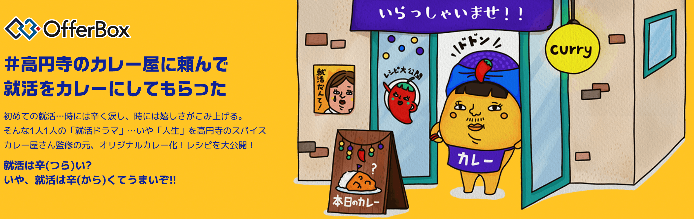 この度、「#高円寺のカレー屋に頼んで就活をカレーにしてもらった」企画を公開しました。本企画では、当社が運営する新卒ダイレクトリクルーティングサービス「OfferBox(オファーボックス)」を通じて就職活動をした学生4名が経験した経験や想いをインタビューし、一人一人に合ったカレーをかりい食堂さん(東京都杉並区高円寺)に協力いただき作りました。それぞれの想いが詰まったカレーレシピも公開中です。