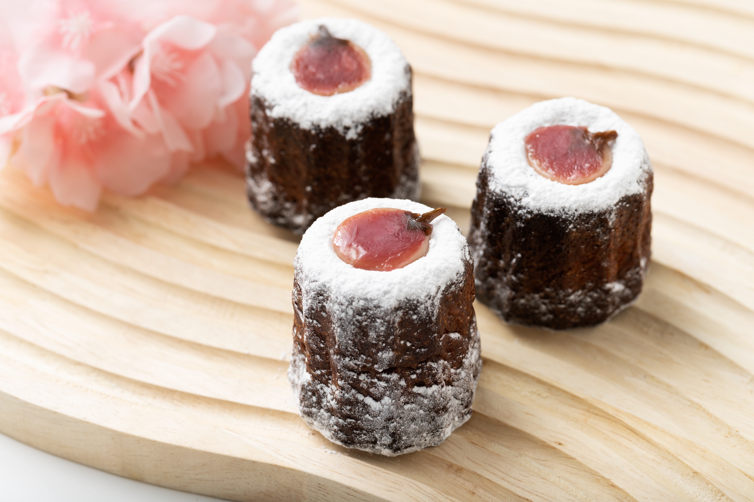 桜風味のカヌレに桜のチョコクリームと桜の塩漬けをトッピングした、この時期限定の春らしいカヌレです。