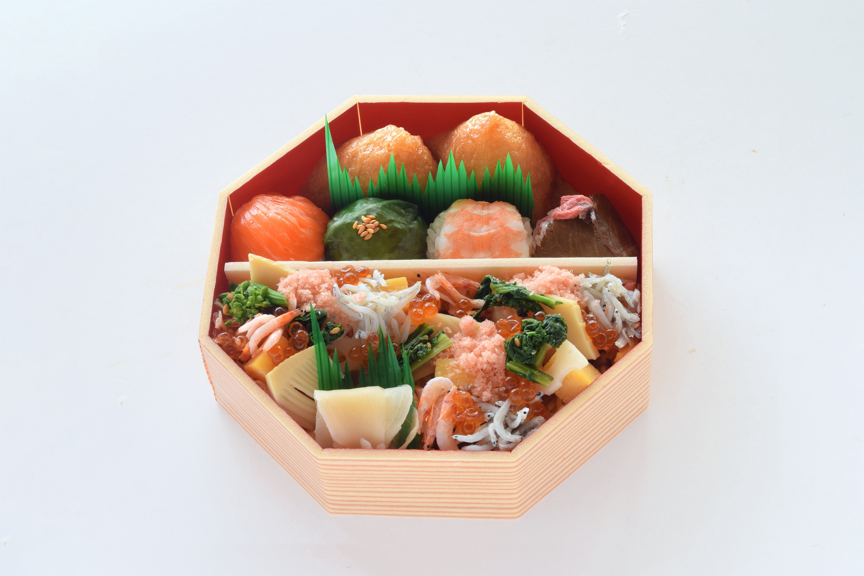 瀬戸内産釜揚げしらすや菜の花、筍などを彩り良く盛りつけたちらし寿司に4種のてまり寿司、いなりを詰め合せた華やかな一品。